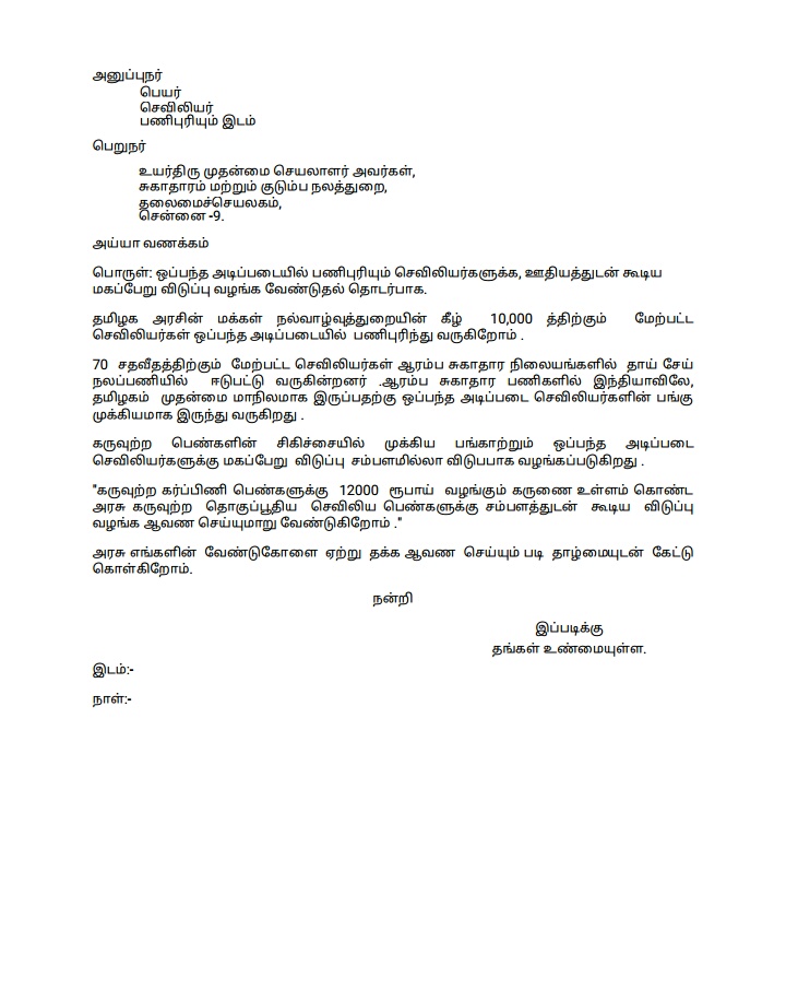 தமிழக சுகாதார துறையில் பணிபுரியும் ஒப்பந்த அடிப்படை செவிலியர்களுக்கு மகப்பேறு விடுப்பு கொடுப்பதில்லை, அப்படியே கொடுத்தாலும் ஊதியம் வழங்குவதில்லை.